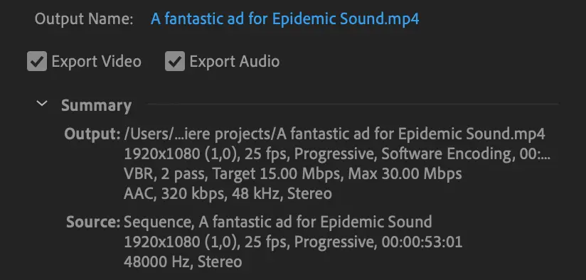 Pretty much half of your video will be audio, so don’t miss these settings when exporting! If you’ve soundtracked your video with music from Epidemic Sound, you can use the maximum sample rate of 48,000 Hz for the highest possible audio quality export.