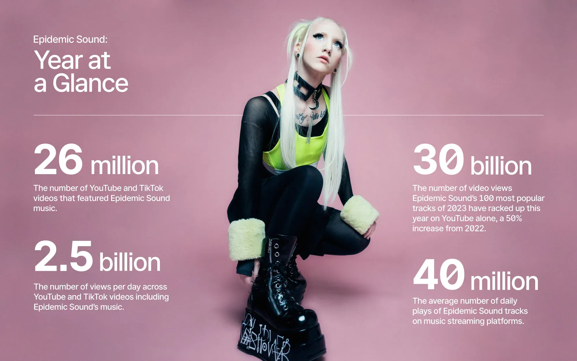 In 2023, Epidemic Sound’s music continued to be an integral part of countless stories and narratives. Our music was featured in over 26 million YouTube and TikTok videos, generating 2.5 billion views per day across both platforms — surpassing the viewership of the 2023 Super Bowl by more than 20 times each day.