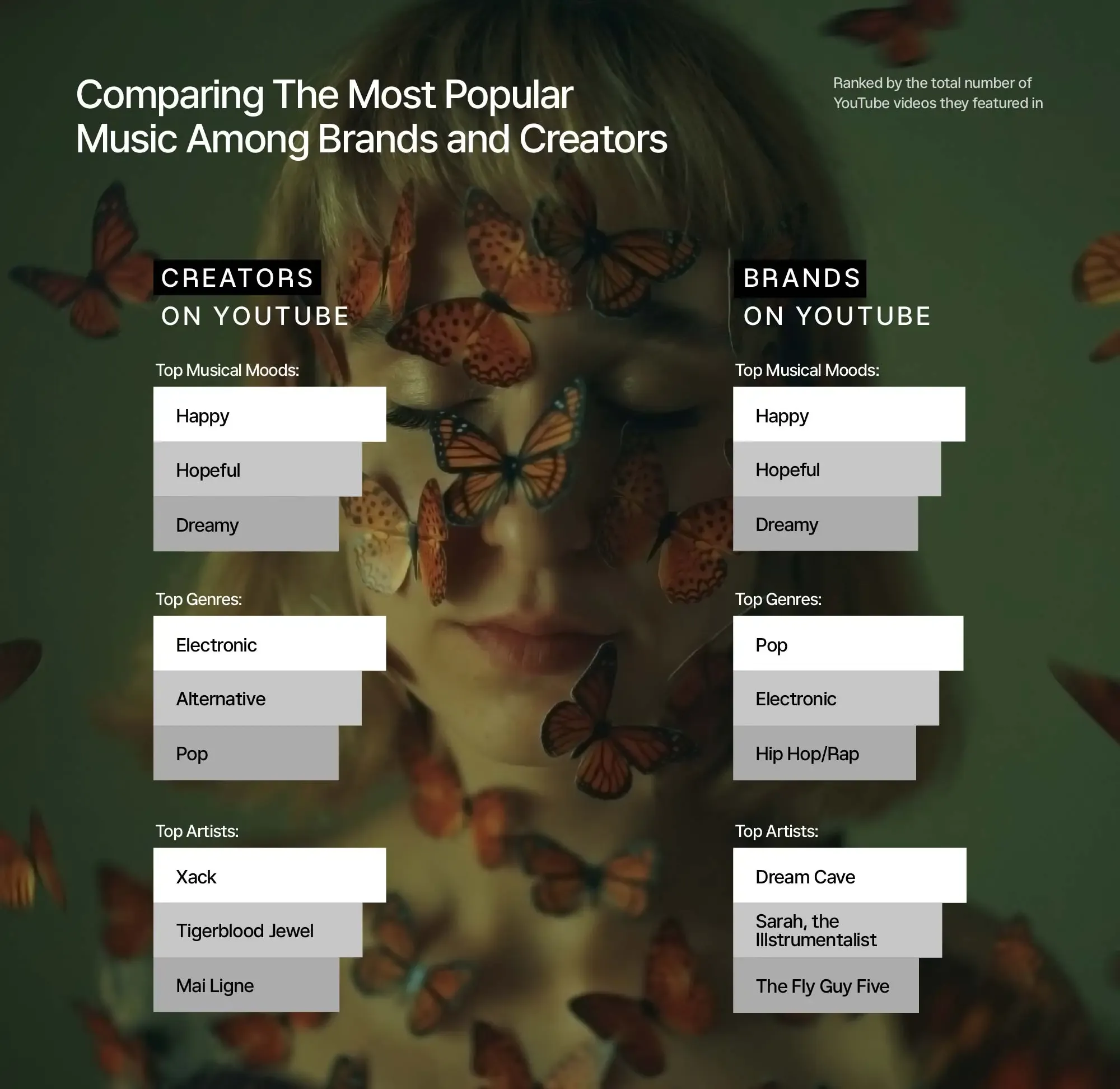 By comparing musical trends among YouTube content creators against those within a subset of thousands of YouTube channels from brands including Red Bull, Ubisoft, and L’Oreal, our research highlights a noteworthy alignment between brands and content creators.